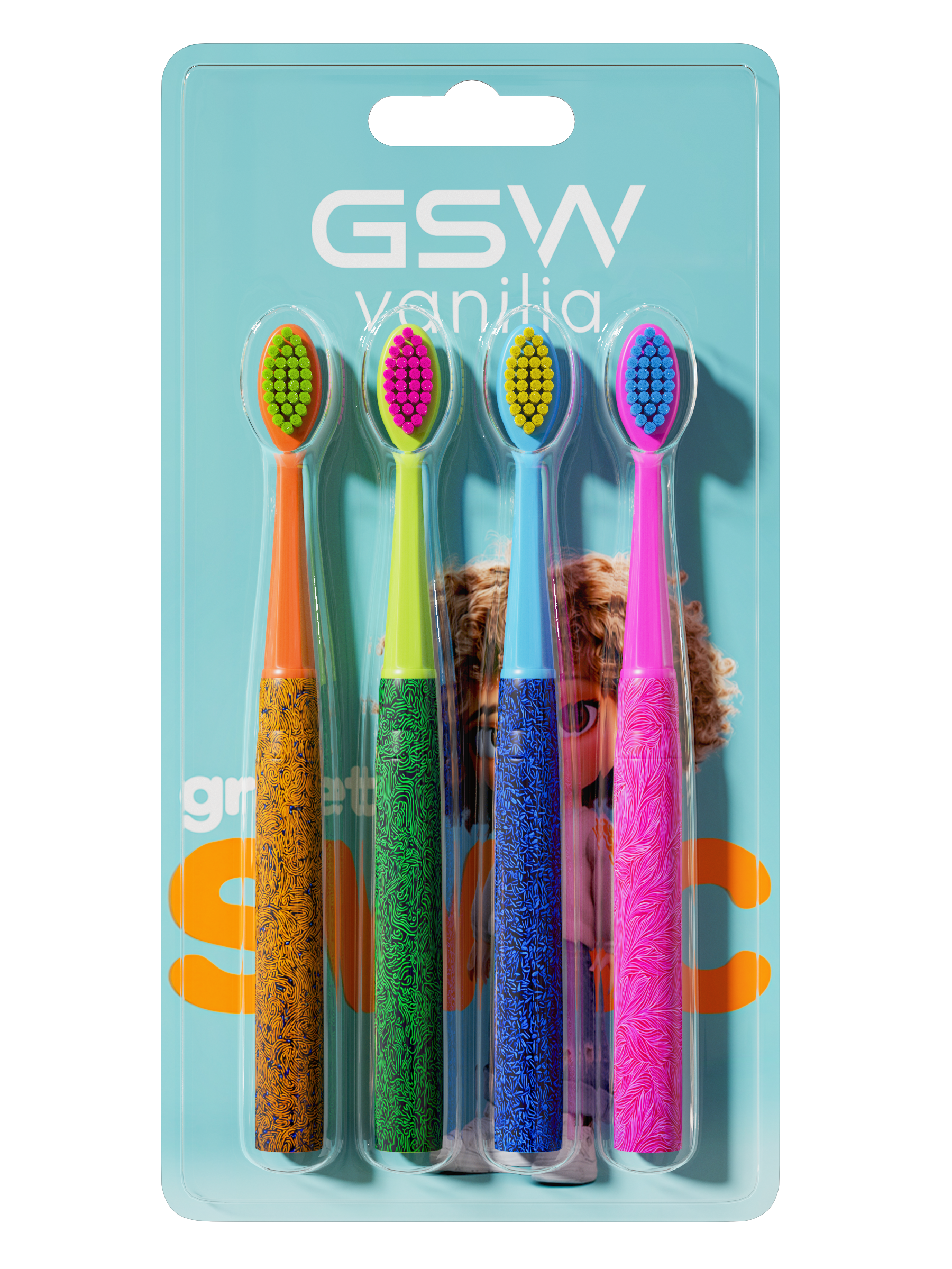 This 4-piece toothbrush set comes in a convenient blister card package with a hang tab, perfect for retail display and easy storage. Each toothbrush features a cylindrical handle with vibrant, custom-printed patterns, and is designed with a unique color combination for both the handle and bristles across the four pieces, making the set visually appealing and fun to use.