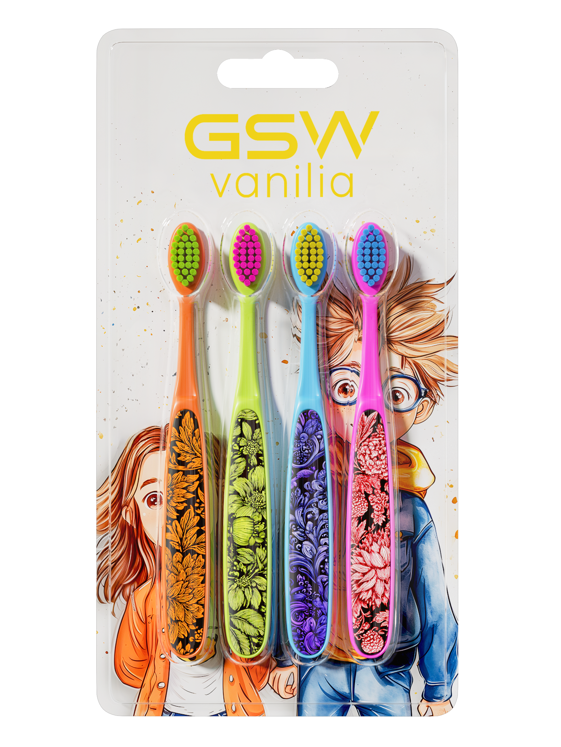 4-pack kids’ toothbrushes with colorful printed handles and matching bristles. Packaged in a hang-tab blister card. Customizable with your brand. Free samples for qualified inquiries.