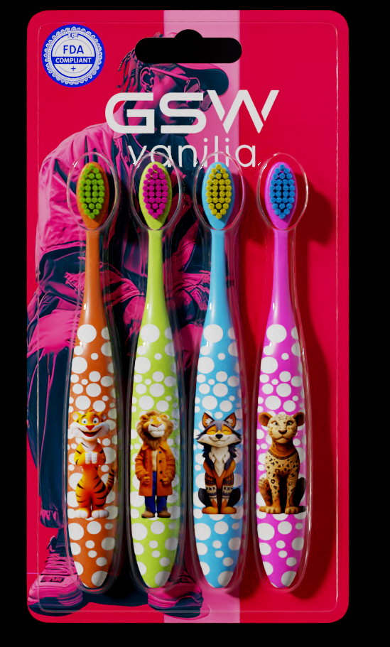 - Delight kids with our original animal cartoon character toothbrushes! Each brush in this 4-pack features a unique, friendly animal design that sparks imagination and makes brushing fun. Perfect for branding with your logo.