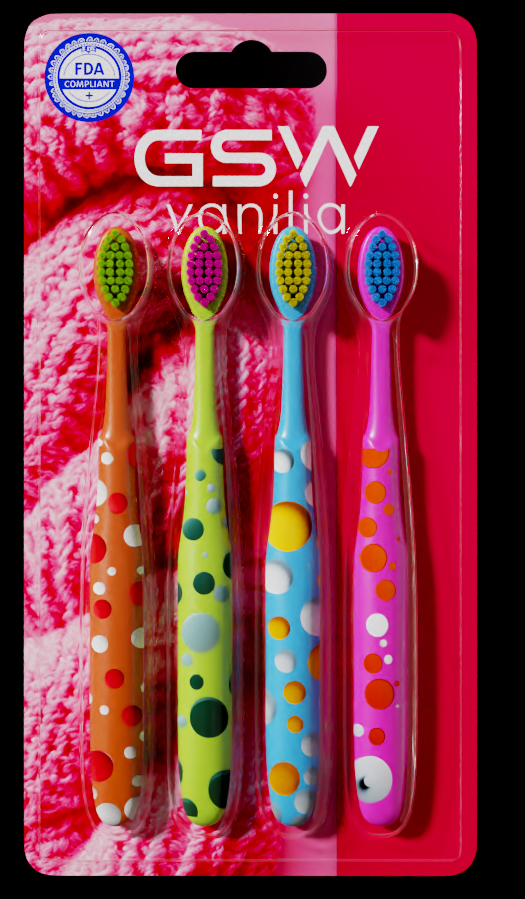 - For a modern, stylish look, choose our abstract pattern series. Each toothbrush in this 4-pack boasts vibrant, irregular graphics that are visually stimulating and appeal to trend-conscious kids and parents. Fully open to logo customization.