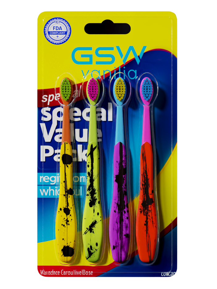 - For a modern, stylish look, choose our abstract pattern series. Each toothbrush in this 4-pack boasts vibrant, irregular graphics that are visually stimulating and appeal to trend-conscious kids and parents. Fully open to logo customization.